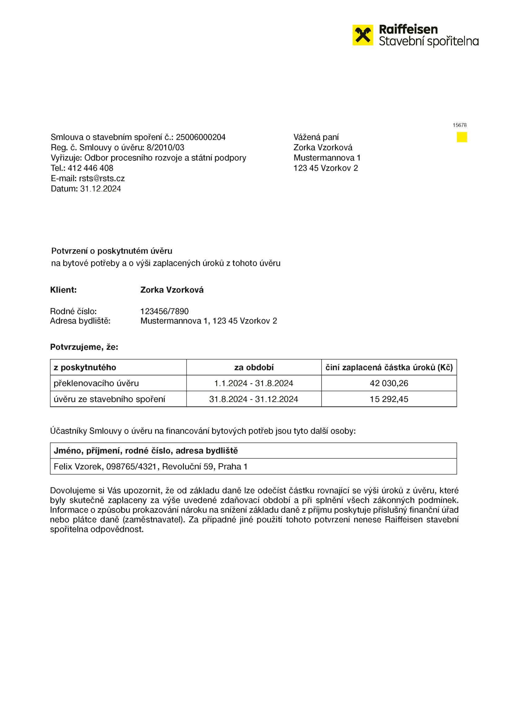 Částka úroků na Potvrzení o poskytnutém úvěru odpovídá úrokům, které byly skutečně zaplaceny za uvedené období. Tyto zaplacené úroky nejsou rovny součtu měsíčních předpisů úroků uváděných na výpisu z účtu překlenovacího úvěru nebo úvěru ze stavebního spoření.