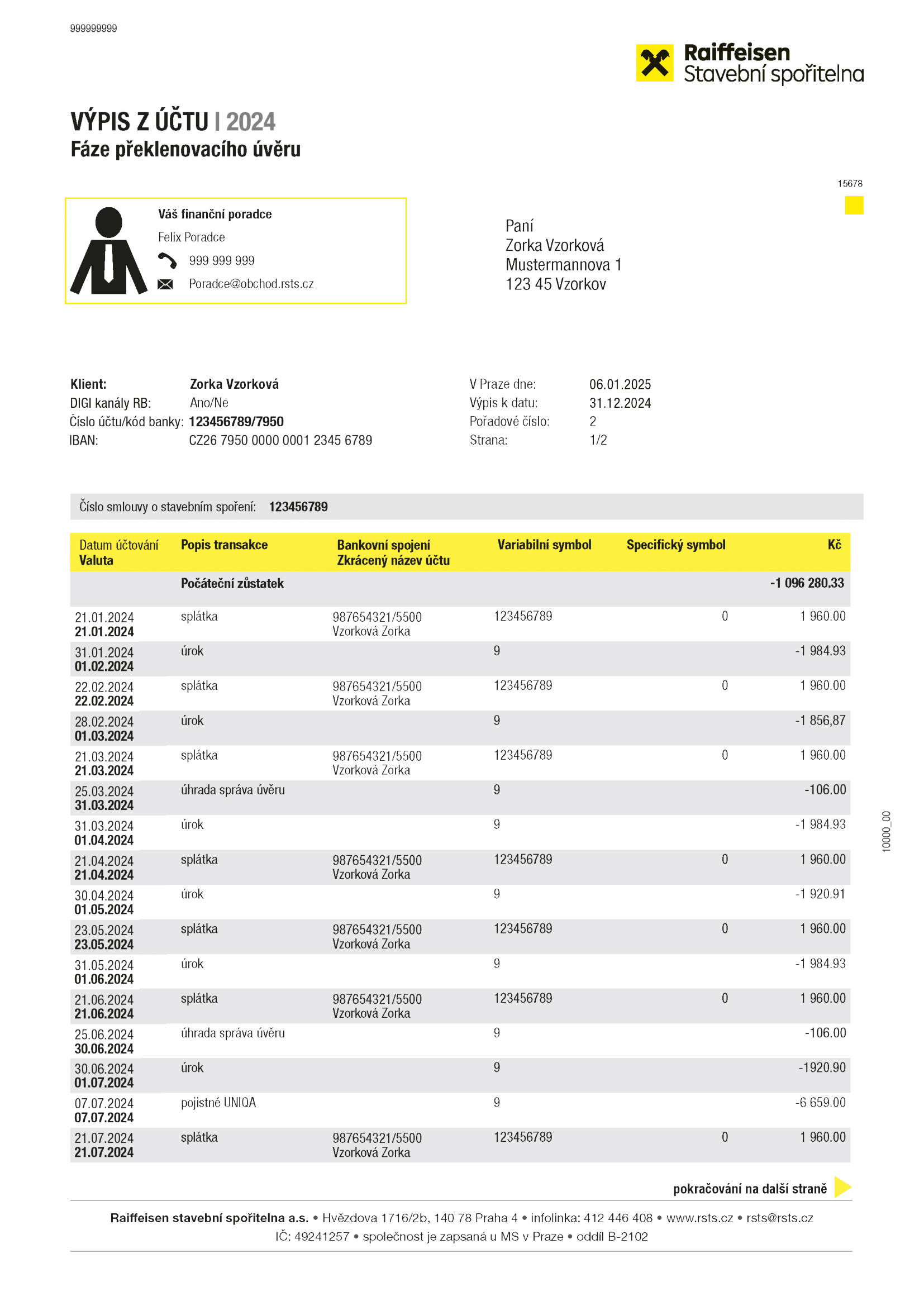 Zaúčtována úhrada za vedení účtu, která je vypočtena za skutečnou dobu platnosti účtu, tj. od 1. 1. 2024 do konce daného čtvrtletí (ve výši dle platného Sazebníku úhrad za poskytované služby podle tarifu příslušné smlouvy o stavebním spoření).
