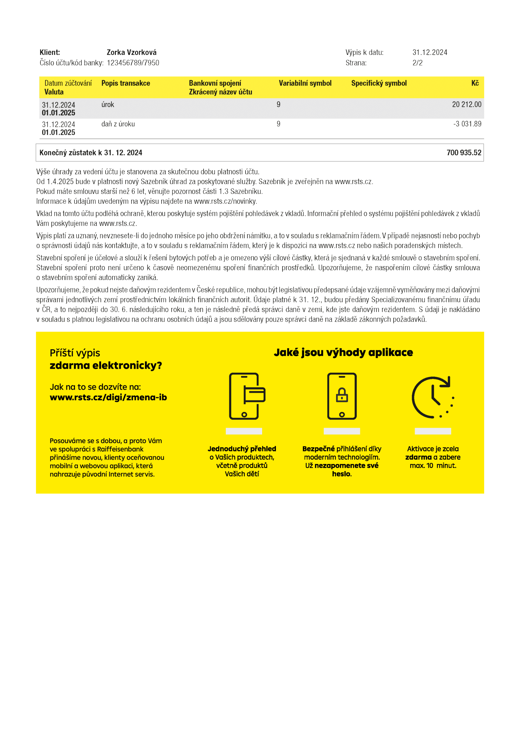 Konečný zůstatek na účtu stavebního spoření k 31. 12. 2024. Pokud výpis z účtu stavebního spoření vykazuje záporný zůstatek, je třeba uvedenou částku uhradit co nejdříve mimořádnou platbou na účet stavebního spoření!