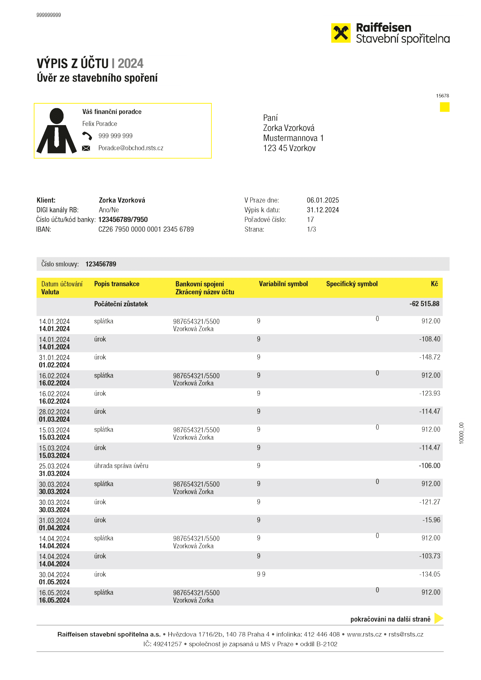Zaúčtována úhrada za vedení účtu, která je vypočtena za skutečnou dobu platnosti účtu, tj. od 1. 1. 2024 do konce daného čtvrtletí (ve výši dle platného Sazebníku úhrad za poskytované služby podle tarifu příslušné smlouvy o stavebním spoření).